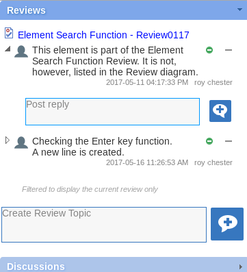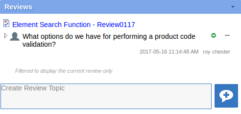 打开并阅读Review元素的内容后,您可以添加自己的审阅主题或回复现有点。要执行此操作,请单击要注释的元素的名称,然后显示该元素的“属性”视图。“属性”视图包含一个“审核”面板,其中包含任何现有审阅主题和“创建审阅主题”提示。