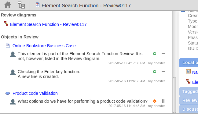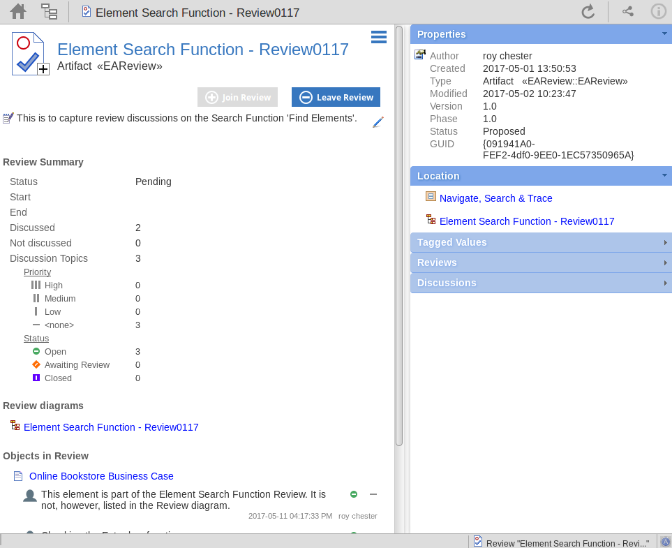 创建Review元素时,还会自动创建子图。Enterprise Architect和WebEA都认为添加到此图表中的任何元素都需要在审核期间进行评论。当在WebEA中加载Review元素的属性时,“Review in Review”部分将包含已经评论或已添加到Review图表的所有元素的列表。此列表提供了一种快速导航到Review中每个元素的便捷方式。