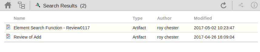要查看模型中可用的最新Review元素,请单击WebEA标题中的“搜索”图标,然后选择“评论”选项。这会搜索最近的Review元素,并在“搜索结果”视图中列出它们,最近更改的元素位于列表顶部。