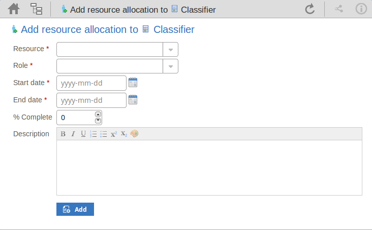 单击此按钮以提交详细信息并在所选元素上创建资源分配记录。 显示以下消息: <name>的资源分配已成功添加到<element name>。 或者:
