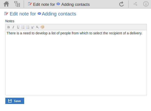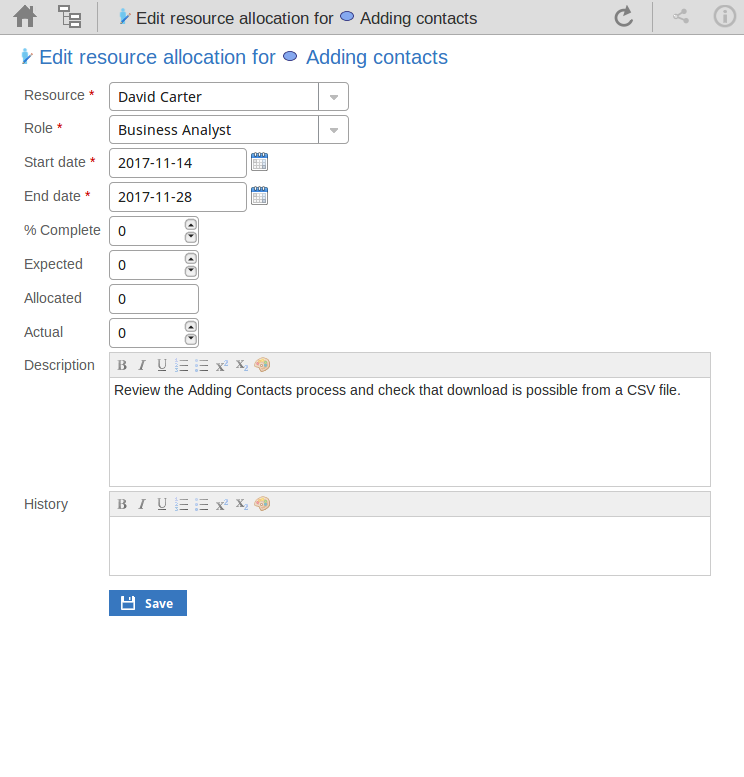 如有必要,编辑资源分配的描述,或许可以解释您对早期字段所做的更改。 您可以使用Notes工具栏中提供的工具格式化此文本,如“ 编辑注释”部分中所述。 在更改文本之前,您可能希望将其复制以粘贴到“历史记录”字段中以进行编辑。 |