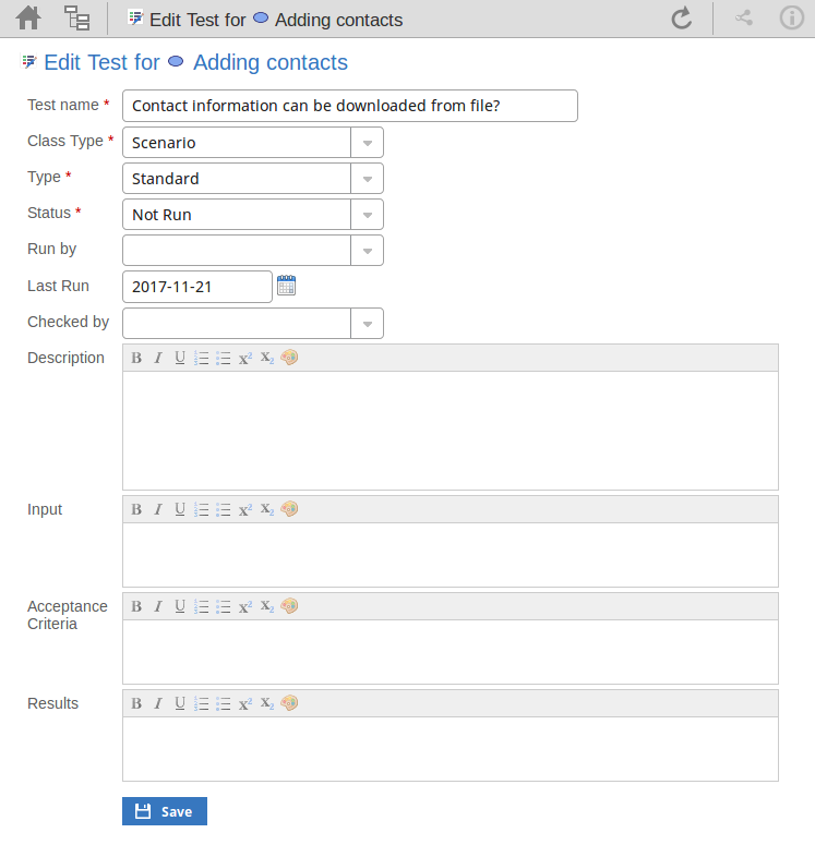 分配给元素的测试支持一系列情况,包括用户接受和场景。可能会要求您定义或执行与您作为客户或用户相关的模型部分的测试,或者您可能希望添加从您要求执行评估的其他人获取的信息。因此,您可能需要编辑测试记录以使用您的信息更新它们。