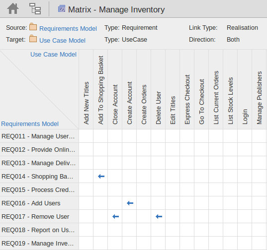 这是WebEA显示的示例关系矩阵。它几乎与Enterprise Architect中显示的内容完全相同。