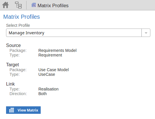 “矩阵配置文件”页面提供了一个下拉字段,您可以使用该字段列出并从Enterprise Architect中定义的矩阵配置文件中进行选择。您无法添加或编辑这些配置文件。