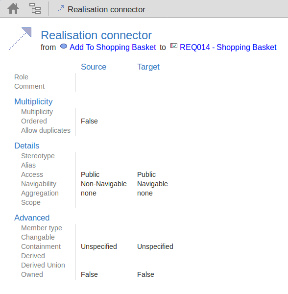 当您单击关系箭头时 - 例如,在示例中,“添加到购物篮”到“REQ014 - 购物篮”箭头 - 将显示“关系属性”屏幕。
