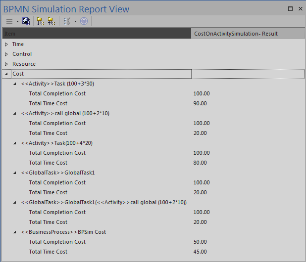 - Total Completion Cost is 100, matching the FixedCost (100) on GlobalTask1 setting in BPSim