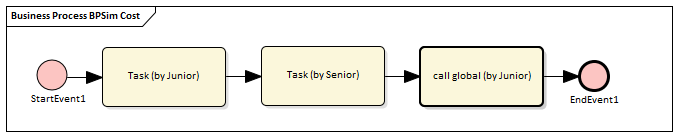 - Ctrl+drag the elements from the Project Browser onto a diagram, pasting GlobalTask1 as an Invocation (Call Activity) named call global (by Junior)