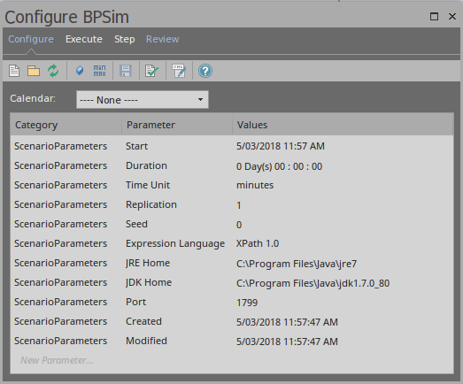 - Configure: Configure BPSim parameters for each BPMN Element; Define Property Parameters, Calendars and Scenario Parameters.