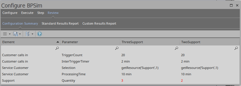 Simulate > BPSIM > Open BPSIM Manager, Review Page |