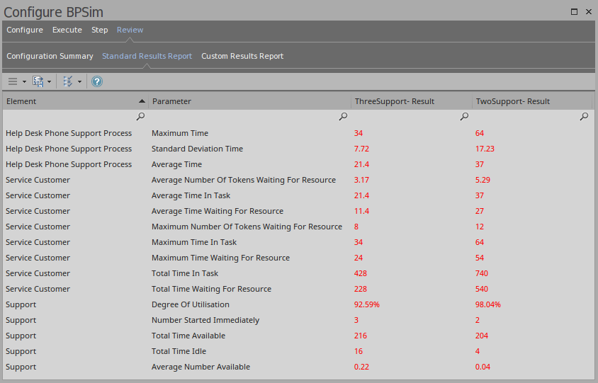 Seen from this example, when the number of support decrease from 3 to 2, the average time waiting for resource increase from 11.4 to 27 minutes.
