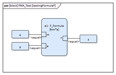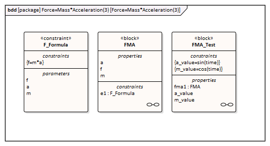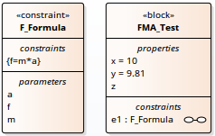 - A block 'FMA' is modeled with properties 'a', 'f', and 'm' and a constraintProperty 'e1', typed to Constraint Block 'F_Formula'