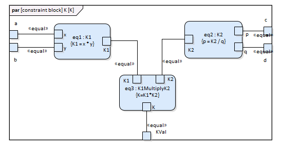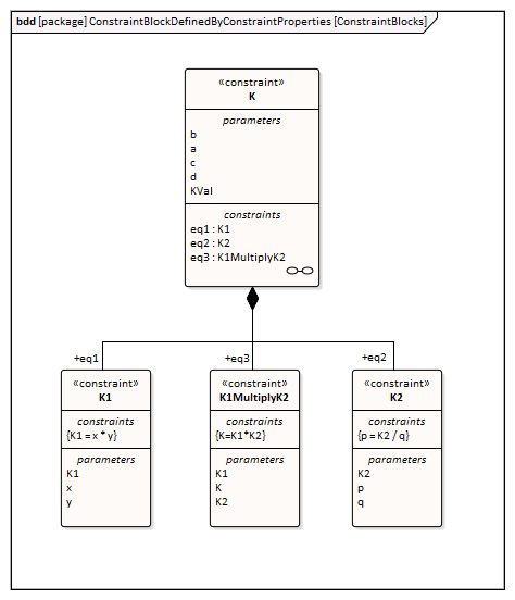 In this figure, Constraint Block 'K' defines parameters 'a', 'b', 'c', 'd' and 'KVal', and three constraint properties 'eq1', 'eq2' and 'eq3', typed to 'K1', 'K2' and 'K1MultiplyK2' respectively.