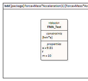 - The block 'FMA' does not have any initial value set on its properties, and the properties 'a', 'f' and 'm' are all variable, so their value change depends on the environment in which they are simulated