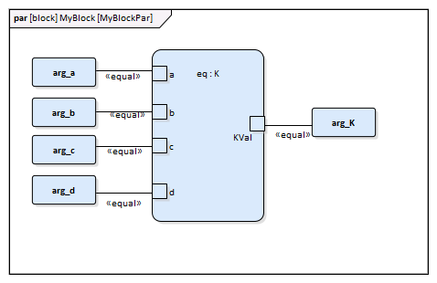 Create a Parametric diagram in Constraint Block 'K' and connect the parameters to the constraint properties with Binding connectors, as shown: