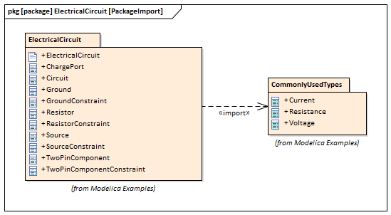 In the Electrical Circuit example, the Artifact is configured to the Package 'ElectricalCircuit', which contains almost all of the elements needed for simulation. However, some properties are typed to value types such as 'Voltage', 'Current' and 'Resistance', which are commonly used in multiple SysML models and are therefore placed in a Package called 'CommonlyUsedTypes' outside the individual SysML models. If you import this Package using an Import connector, all the elements in the imported Package will appear in the SysMLSim Configuration Manager.