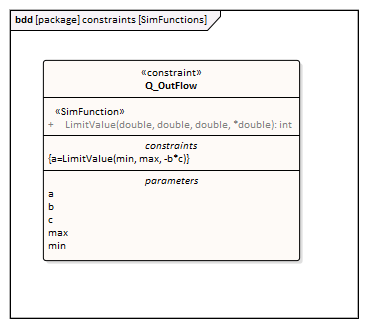 When generating code, Enterprise Architect will collect all the operations stereotyped as 'SimFunction' defined in Constraint Blocks and Blocks, then generate code resembling this: