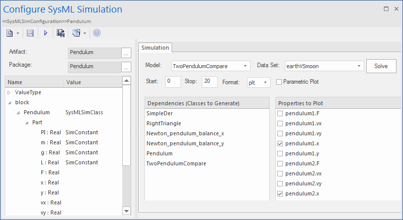 The SysMLSimConfiguration Artifact collects the elements (such as Blocks, Constraint Blocks and Value Types) of a Package. If the simulation depends on elements not owned by this Package, such as Reusable libraries, Enterprise Architect provides an Import connector between Package elements to meet this requirement.