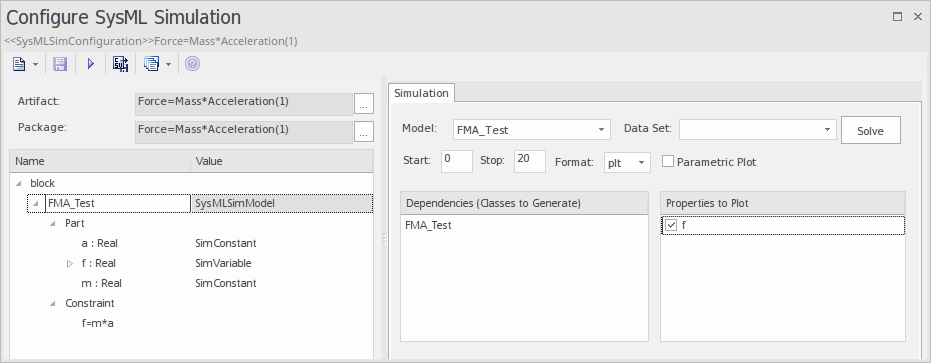 - Create a SysMLSim Configuration Artifact 'Force=Mass*Acceleration(1)' and point it to the Package 'FMA_Test'.