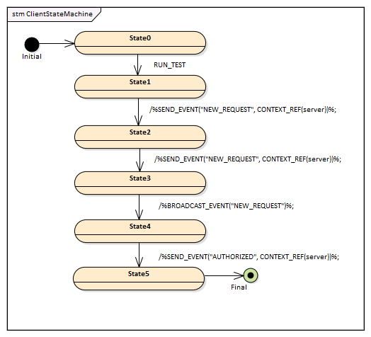 - A Class element TestClient, to which you add a StateMachine ClientStateMachine.