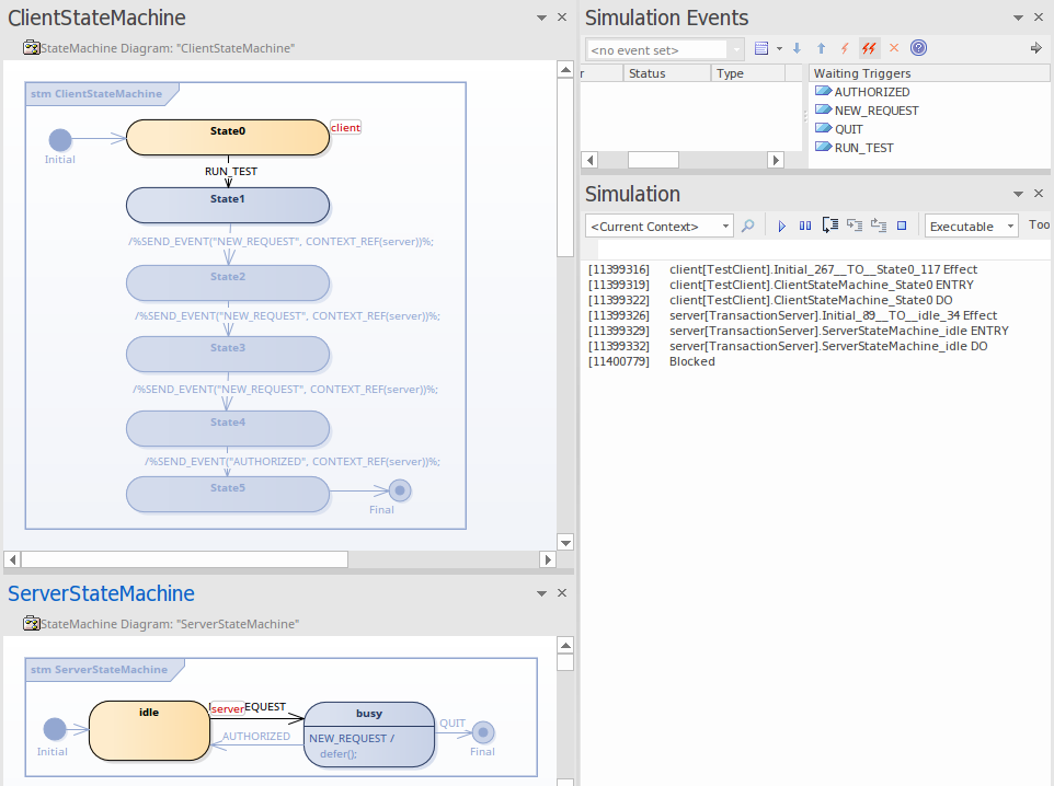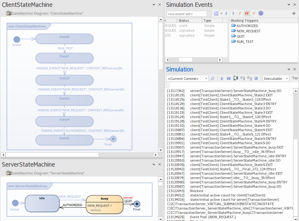 - Double-click on RUN_TEST in the Simulation Event window to trigger it. The event NEW_REQUEST will be triggered three times (by SEND_EVENT and BROADCAST_EVENT) and AUTHORIZED will be triggered once by SEND_EVENT.