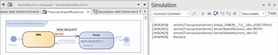- Double-click on NEW_REQUEST in the Simulation Event window to execute it as the Trigger; idle is exited and busy is activated.