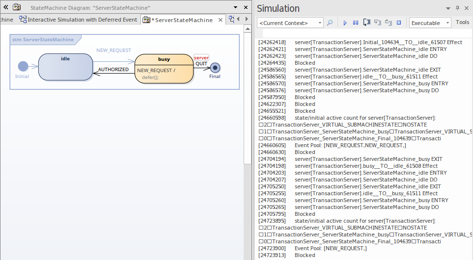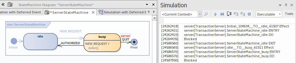 This example shows a model using Deferred Events, and the Simulation Events window showing all available Events.