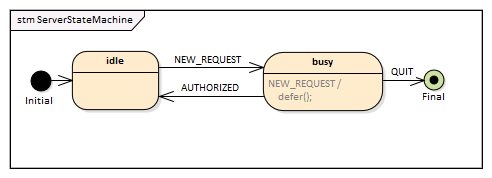 - Transition (with event NEW_REQUEST as Trigger and defer(); as effect) to busy