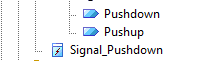 Triggers are either created as an instance of a Signal element or as an anonymous event. Triggers are connected to Transitions in the 'Transition Properties' dialog as shown here. In this example a Trigger named 'Pushdown' has been defined based on the Signal 'Signal_Pushdown'.
