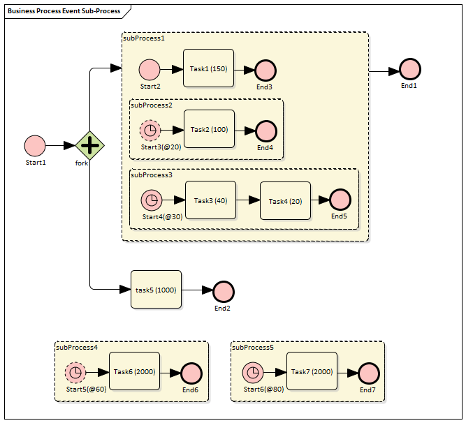 - Event Start4(@30) is Interrupting, it stopped Task1 and Task2 at 30 seconds; it did not affected Task5 because Task5's enclosing process (main process) level is higher than Start4's enclosing Sub-Process (subProcess1)