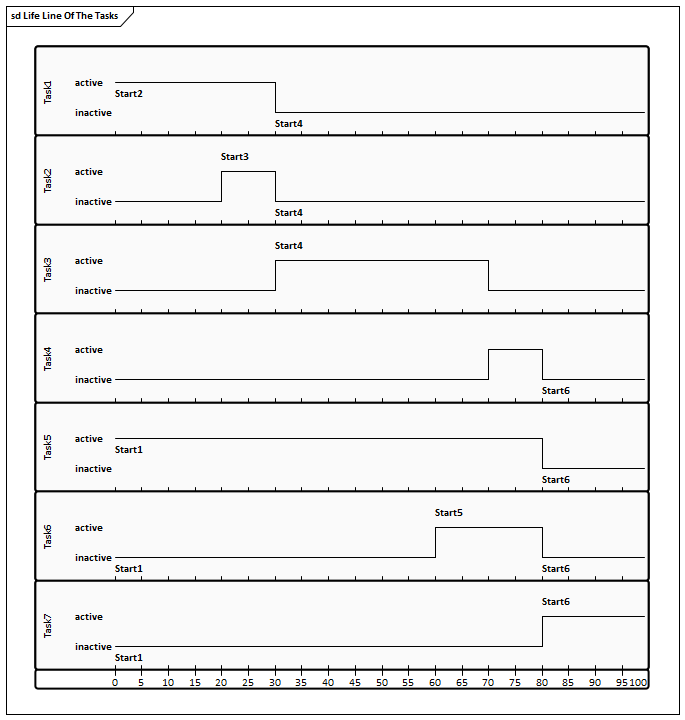 - Event Start6(@80) is Interrupting, it started Task7 at 80 seconds and interrupted the running Tasks (Task4, Task5, Task6) that were in the same or lower level of its enclosing process