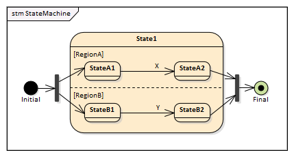 - In RegionA, define StateA1, transition to StateA2, triggered by event X
