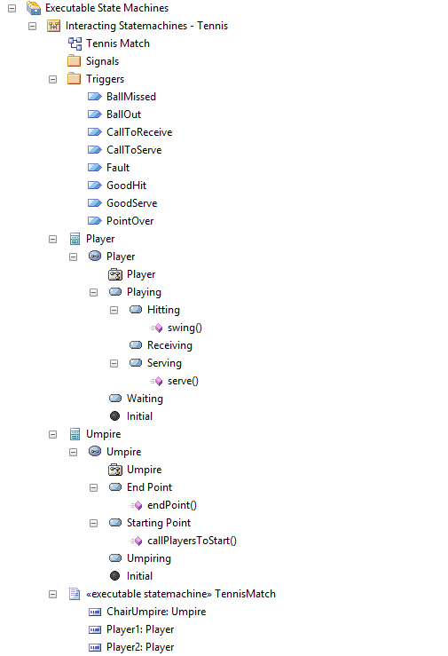 The first task is to build the standard UML Class and State models that describe the entities and behavior to construct. Each Class of interest in your model should have its own StateMachine that describes the various states and transitions that govern its overall behavior. |