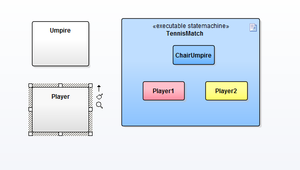 Once you have modeled your Classes and State models, its time to design the Executable StateMachine Artifact. This will describe the Classes and objects involved, and their initial properties and relationships. It is the binding script that links multiple objects together and it determines how these will communicate at runtime. Note that it is possible to have two or more objects in an Executable StateMachine Artifact as instances of a single Class. These will have their own state and behavior at run-time and can interact if necessary. |