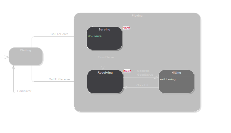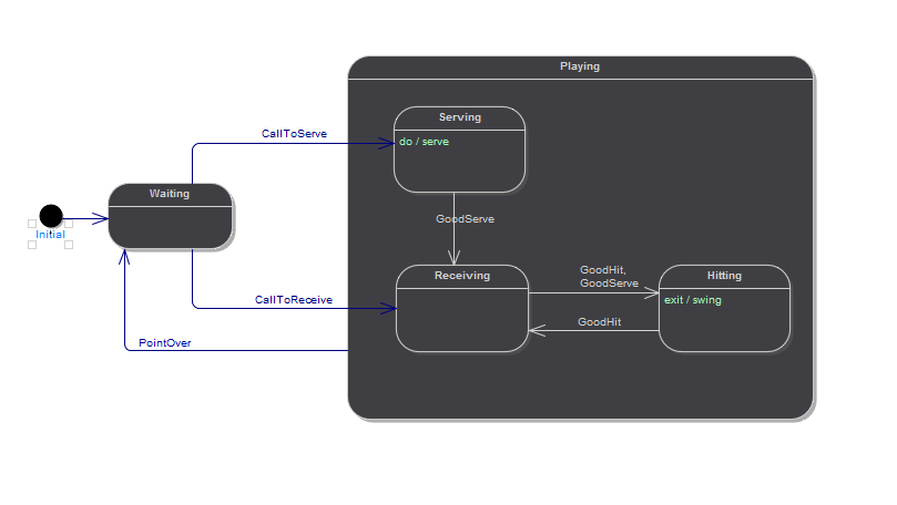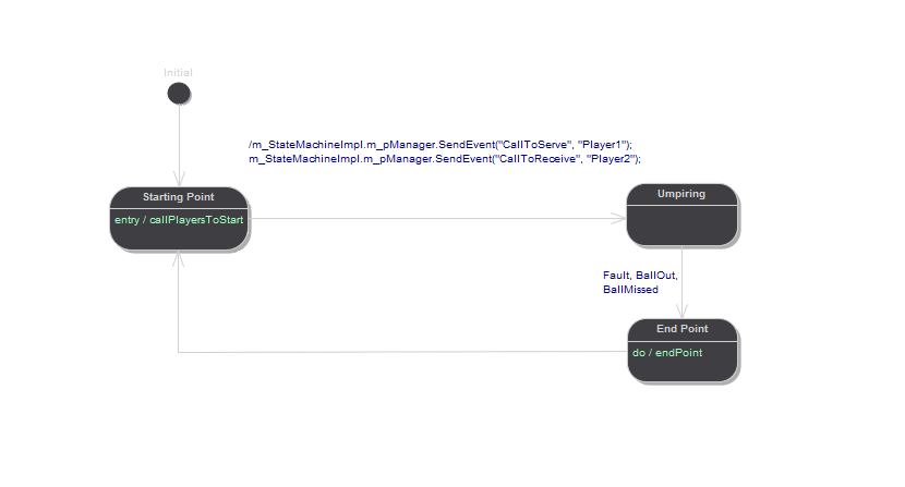 Having sketched out the broad mechanics of your model, you can generate the code to drive it, compile, execute and visualize it in a matter minutes. These points summarize what is required to start executing and simulating StateMachines.