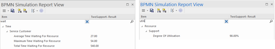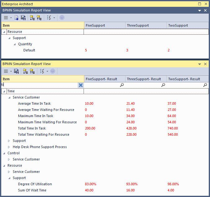 - The two Support resources - are they busy? If they were not, we might have to change the process to use all of their time and reduce the customer's waiting time; however, the 'Degree Of Utilisation' is at 98%, which indicates that the resources had almost no idle time