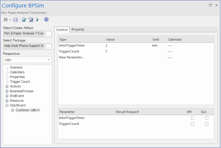 - Expand the 'StartEvent' group and click on Customer calls in; click on the 'Control' tab and, in the 'Value' field for the 'TriggerCount' parameter, change the figure to '20'