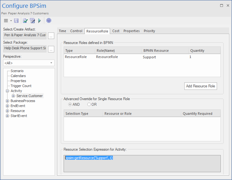 button in the 'BPMN Resource' field and select the Support element you created earlier - In the 'Quantity' field, type '1'