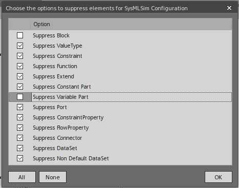 The 'SysML Simulation Configuration' dialog shows all the elements in the Package by default, including Value Types, Blocks, Constraint Blocks, Parts and Ports, Constraint Properties, Connectors, Constraints and Data Sets. For a medium-sized model, the full list can be quite long and it can be difficult for the user to find a potential modeling error.