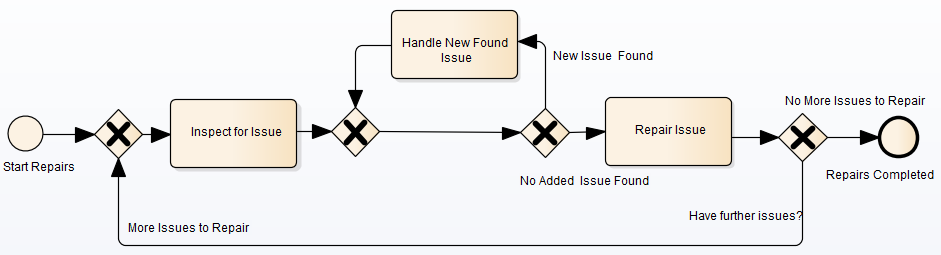The value from the 'Repair Issue' Activity is tested at the 'Have Further Issues?' Gateway. Click on the 'More Issues to Repair' connector and on the 'Control' tab; the Condition parameter for following this path is set to the Expression value {noOfIssues} > 0; flow passes to the Gateway prior to the 'Inspect for Issue' Activity. Similarly, if you click on the 'No More Issues to Repair' connector and on the 'Control' tab, the Condition parameter for following that path is set to the Expression value {noOfIssues} =< 0, and flow passes to the 'Repairs Completed' End Event. Now that you have examined the process flow and configuration settings, you can run a simulation and review the results. |