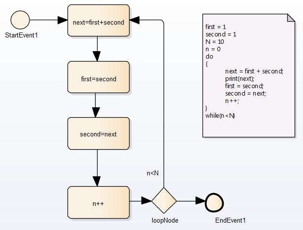 The pseudocode of the process is shown in the Notes element on the diagram. The statement 'print(next)' will output the number series 2, 3, 5, 8, 13, 21, 34, 55, 89, 144.