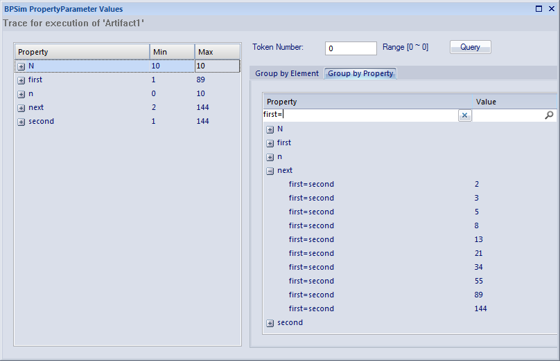 Now examine the values of the 'next' property on entering the first=second Activity in each iteration of the simulation. Click on the 'Group by Property' tab and expand the 'next' item. The list of values is long, so right-click on the column headers and select the 'Toggle Bar' option. Under the 'Property' column heading, type 'first='. This filters the list to show only the property parameter values on entering the first=second Activity.