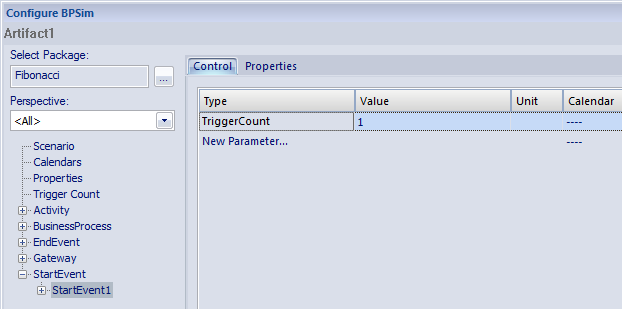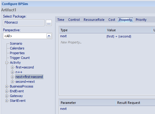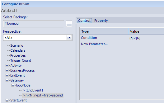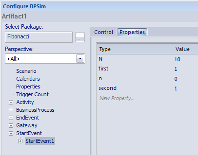 This is a very simple recursive business process that calculates a series of Fibonacci numbers through ten iterations; you can see how the property parameters increment in each iteration through the elements of the process. Open Example Model > Model Simulation > BPSim Models > Fibonacci.