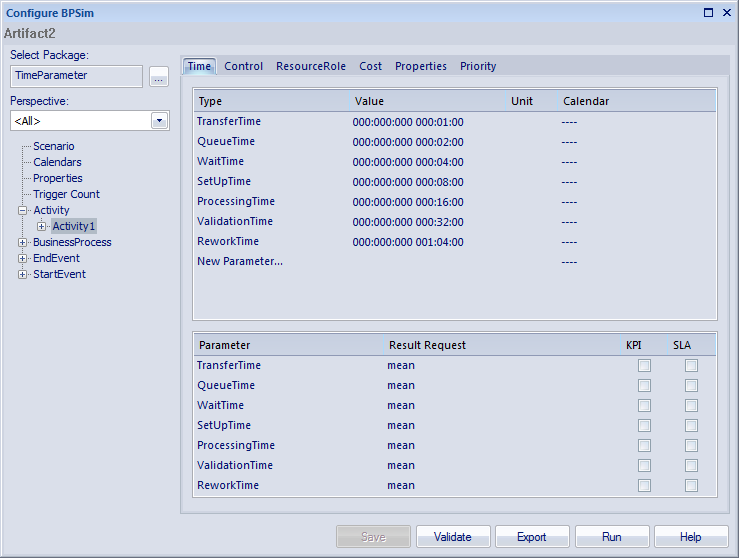 If you double-click on the Artifact2 element, the Configure BPSim window displays. Click on the Activity1 element in the diagram to expand the Activity group, to select Activity1 in the hierarchy at the left of the dialog, and to display the first tab, 'Time', for the element in the configuration, as shown.