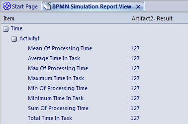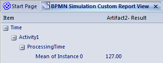 If you return to the 'BPSim Simulation Controller' dialog and click on the Run button, selecting 'Custom Simulation' this time, the Open Result button displays the 'BPMN Simulation Custom Report View'. In the configuration, the Result Requests were for the mean values of the seven parameters. In the Report View for the simulation, you only see the mean of the single aggregated parameter, ProcessingTime, as 127 minutes.