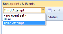 To use a trigger set you first select it by name from the trigger set drop list as in this example image. Once selected it loads the Trigger List window with the defined trigger set. Note that the special item <no event set> means no set is currently selected. At the start of each simulation, if a set is selected, it will be loaded afresh for the next run. If <no event set> is selected, the trigger list will be cleared.