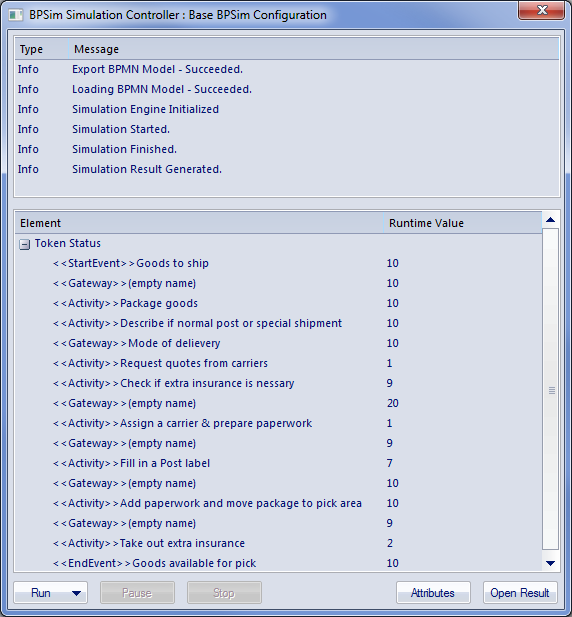 The simulation executes, displaying processing messages in the top section of the dialog, and the elements and parameters processed with the runtime values used from the configuration.