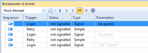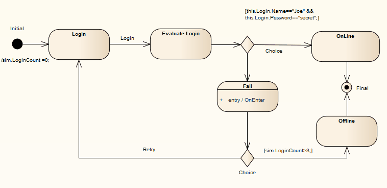 In this example we simulate a simple "three strikes and you are out" login process, taking a user name and password. The success path is waiting for the name "Joe" and the password "secret" (note - it is very important that parameters referencing strings are enclosed in quotes, otherwise the interpreter thinks the name refers to another variable within the simulation).