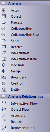 在建模的早期使用分析类型元素来捕获业务流程,活动,协作和一般域信息。它们通常用于分析图。