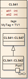 A compartment is added to the element, containing the child diagram. The element is resized to contain the diagram; whilst it can be enlarged, it cannot be reduced to less than the diagram size. You can also display a Composite diagram inside its parent element using a Shape Script. The diagram is displayed in a custom compartment in the center of the element and not necessarily with the standard compartments (such as attributes, tags). |