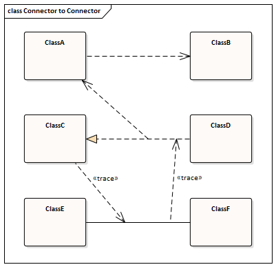 Under certain circumstances, it can be useful to create a connector that issues or terminates (or both) on another connector. For example, you might create a connector between two elements, and then create a link between that connector and a Requirement element to show that the relationship between the two elements was a predefined specification of the design.